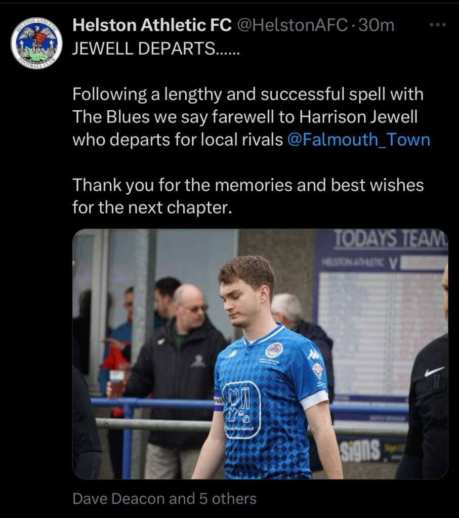 HARRISON JEWELL HARRISON JEWELL Position: Defender 2024/25 Appearances: 13 2024/25 Goals: 0 Total Appearances: 13 Total Goals: 0 Man of the Match: 0 Signed from: Helston Athletic (2024) Sponsored by: JEFF CHAMBERS Share this: Click to share on Facebook (Opens in new window) Facebook Click to share on X (Opens in new window) X Like this:Like Loading...